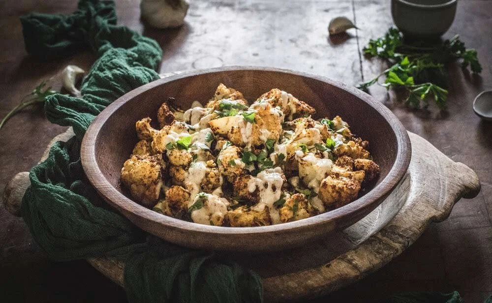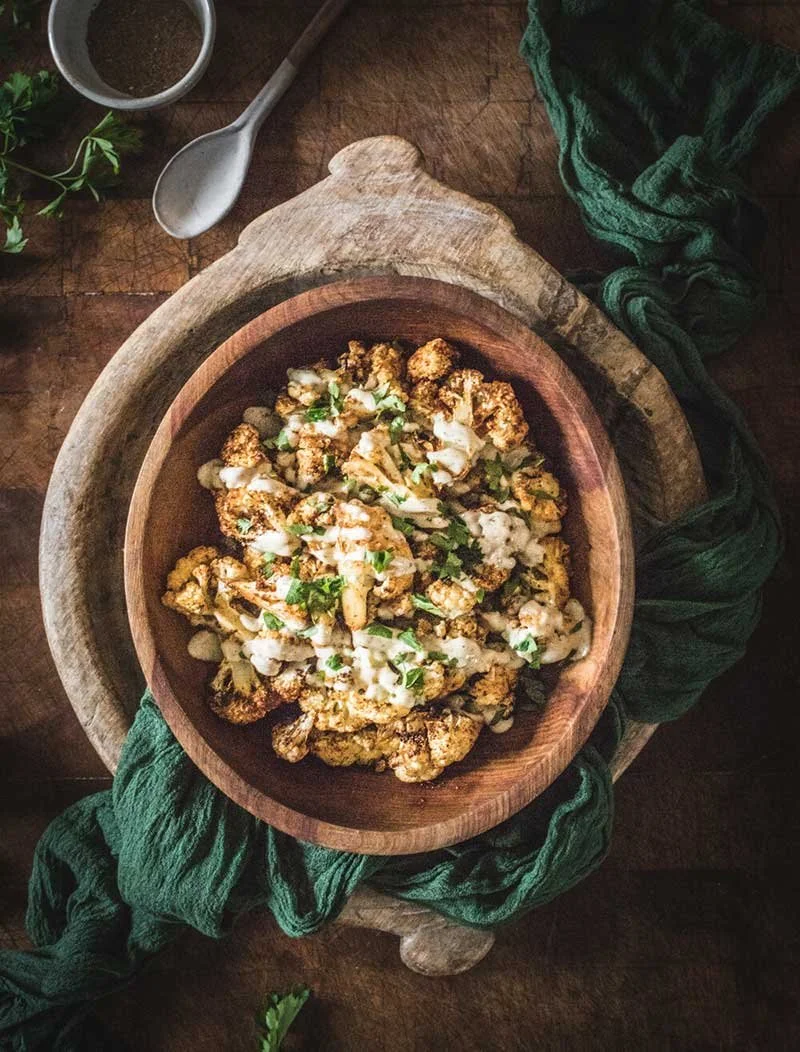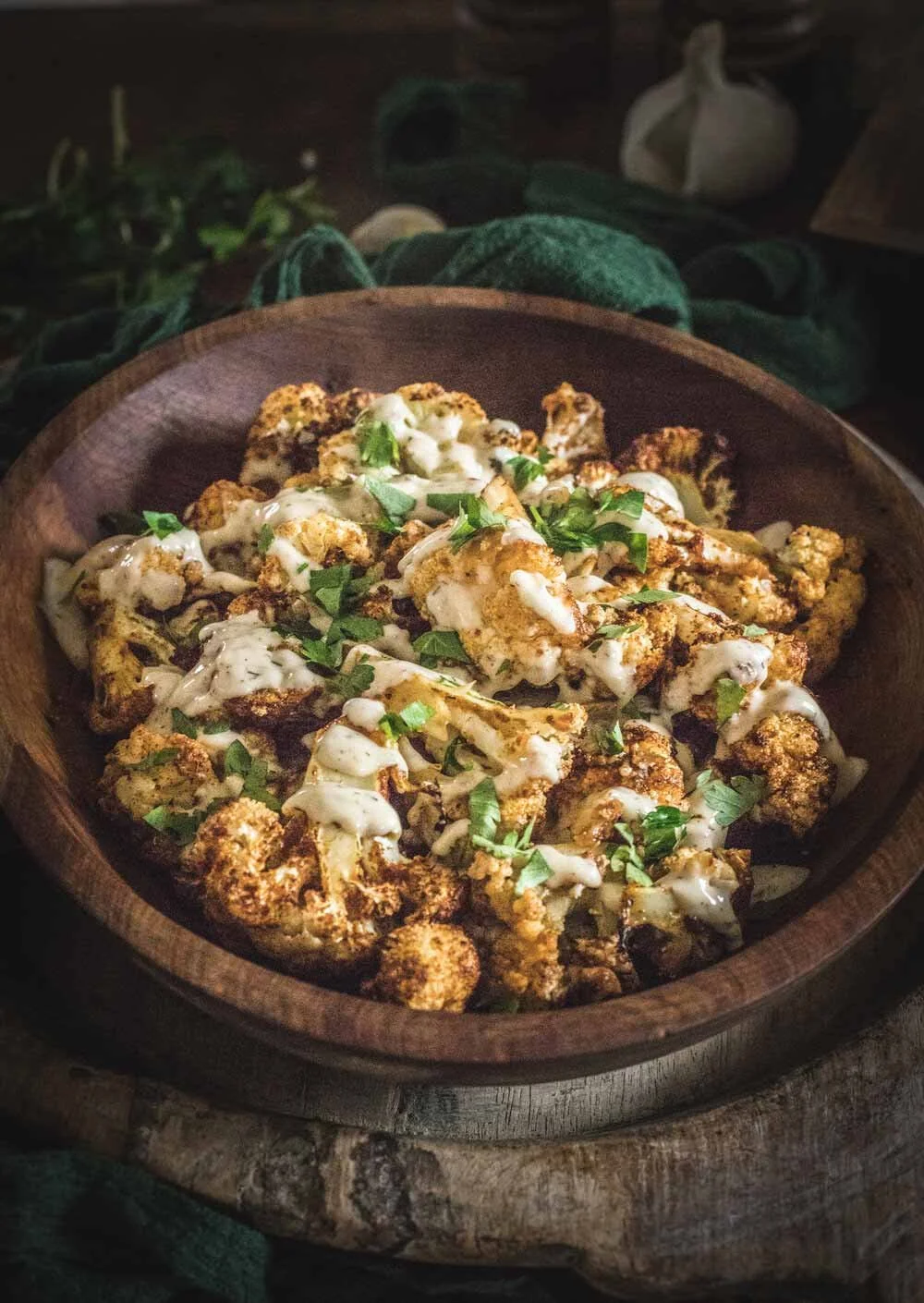 This recipe was born when our family harvested a plethora of heirloom cauliflower from our spring garden and I was considering an exciting way to serve it. Blackened cauliflower is a simple and deeply flavorful side dish to accentuate any wholesome meal. The addition of vibrant blackened seasoning and creamy ranch dressing takes the humble cauliflower to the next level. Please feel free to adjust the amount of cayenne and blackened seasoning used on the cauliflower to suit your family’s taste preferences.